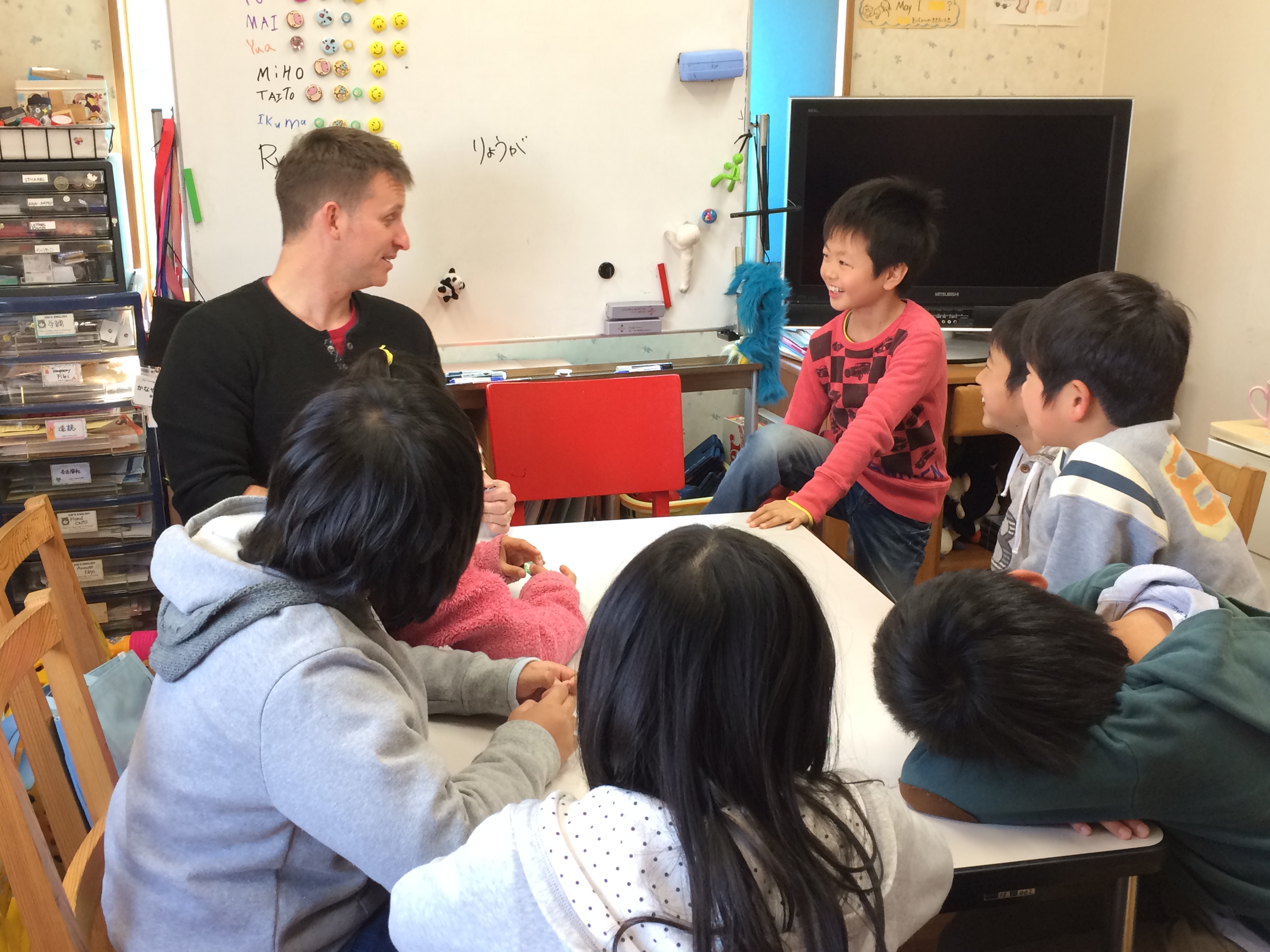 私も。毎日自分のスクールにネイティブの先生がいるという環境は、生徒たちの英語力の為にもそうですが、私自身の英語力キープの為にも願ってもないことで!!しかも彼はどんな年齢の人からも慕われる、とても優しくて、フレキシブルなスポーツマン。
