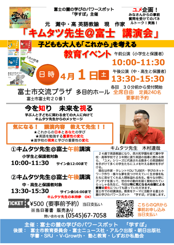 沢山の塾の関係者の先生方にもご賛同&協力いただけました。Easter Bunny English School の飯島先生には教育委員会や富士ニュースの協賛を取っていただいたり、 秀峰スクールZEN の金原先生は私立高校の先生方に声をかけていただき、多くの現場の先生方に足を運んでいただけることにもなりました。本当に大感謝です。